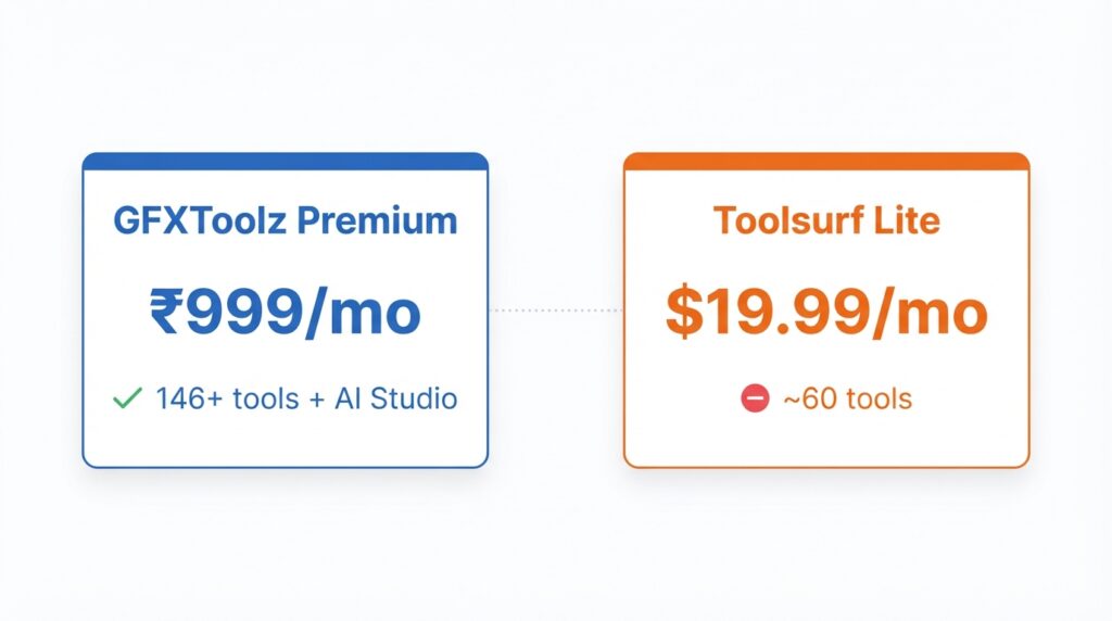 Which costs less? GFXToolz Premium: ₹999/month (~$17) for 146+ tools including AI Studio. Toolsurf Lite: $19.99/month for ~60 tools without AI generation. Toolsurf’s $3/month entry price is cheaper, but that’s one tool, not a bundle.